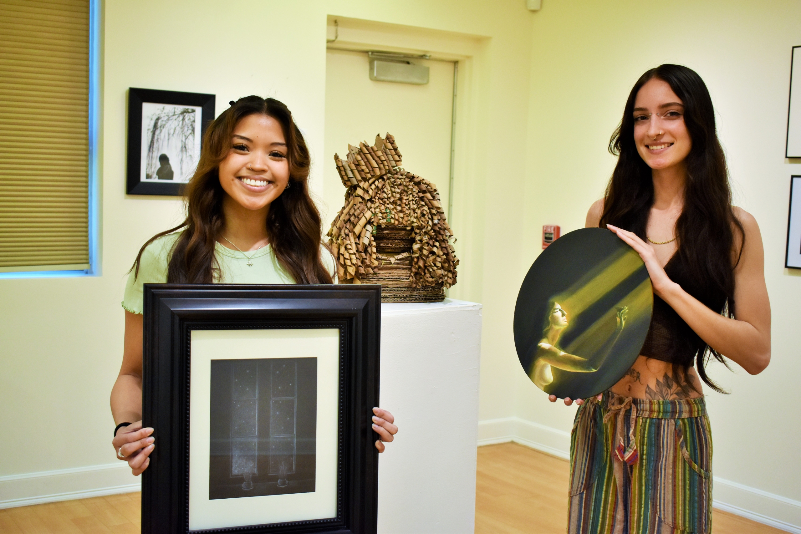 Nicole Torres (left) displays her piece “In the Stillness of the Night” and Celeste Miner holds her “Hope in Darkness,” both selected to be part of the 56th annual Student Art Exhibition at Camden County College in Blackwood.