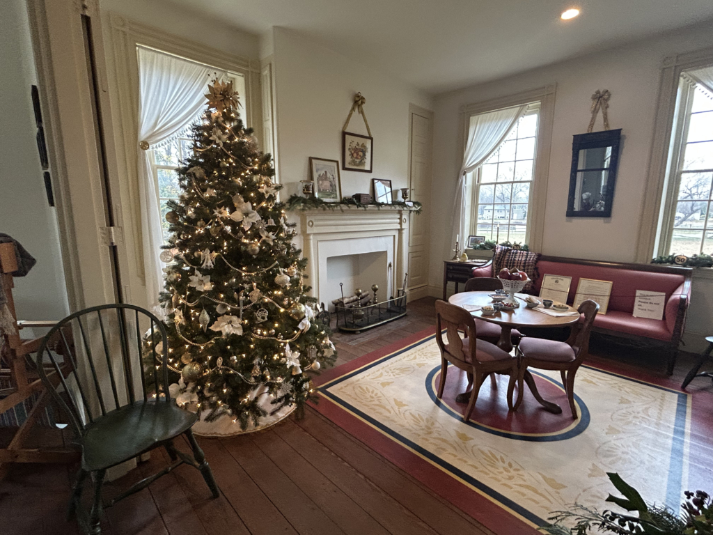 The living area of the Barclay Farmstead’s historic house is decorated for the holiday season.