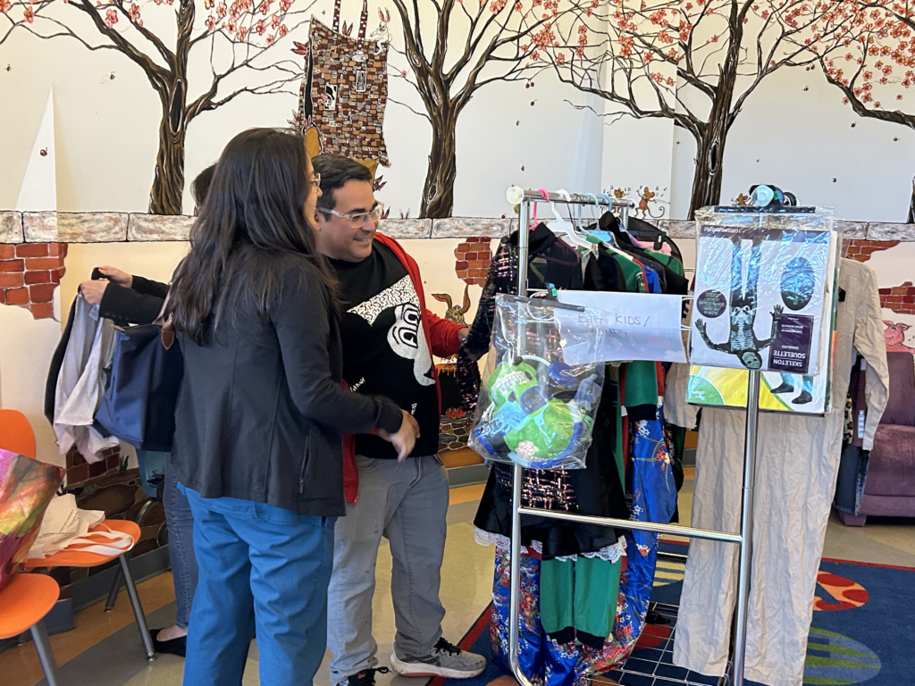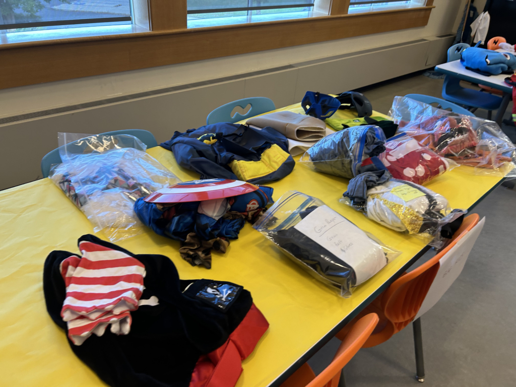 Several tables and clothing racks were set up for the swap, with clothing items sorted into age ranges. Also available were accessories like wigs, masks and hats, and even props like plastic tools.