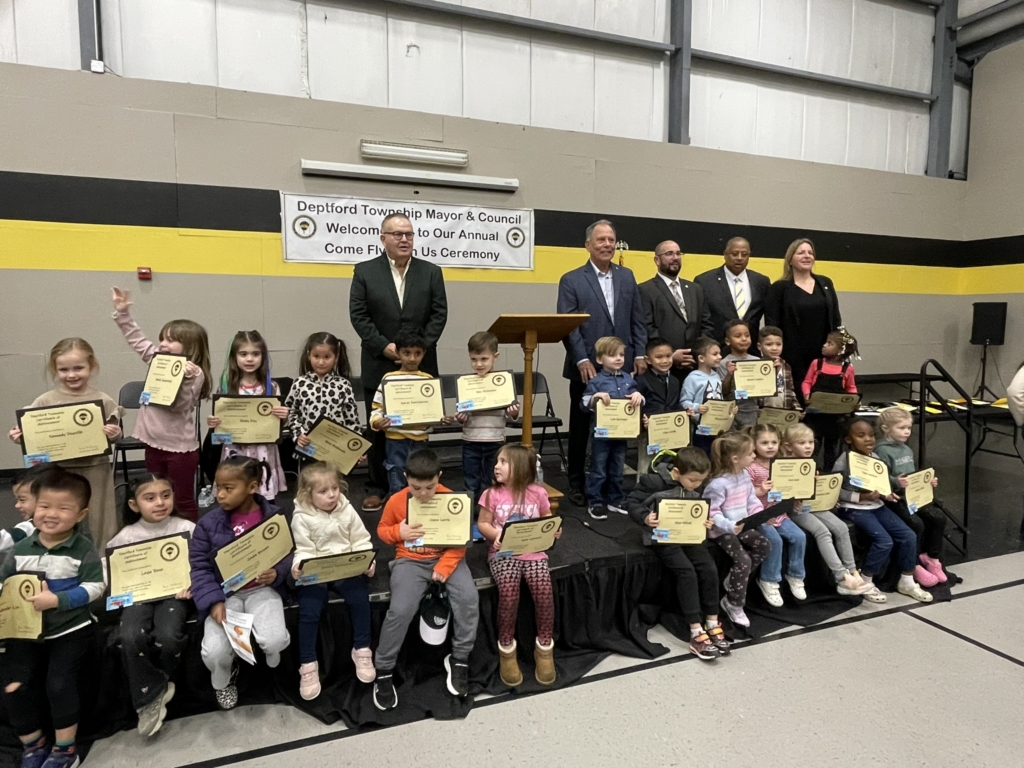 Deptford council members pose with the preschool winners of the Come Fly With Us contest at the recreation center on Jan. 8.