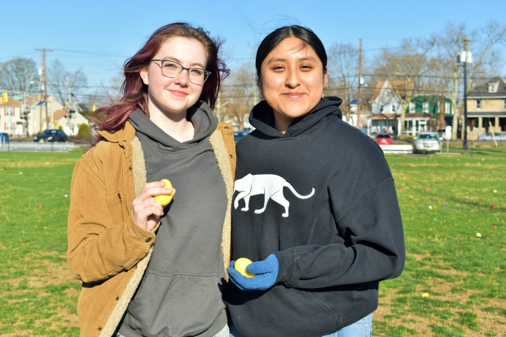 Palmyra High sophomores Maya Richman-Dupont (left) and Melody Morales-Sanchez helped direct children during the hunt on March 28.