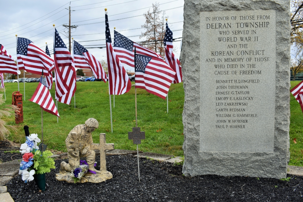 Some 60 American flags displayed in front of the Delran municipal building were flying wildly and proudly in a gusty, cold wind on Veterans Day to honor vets from the town.