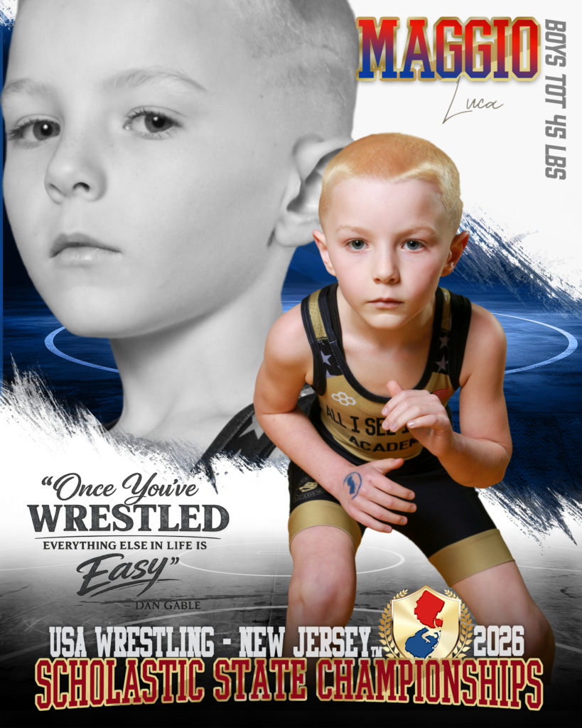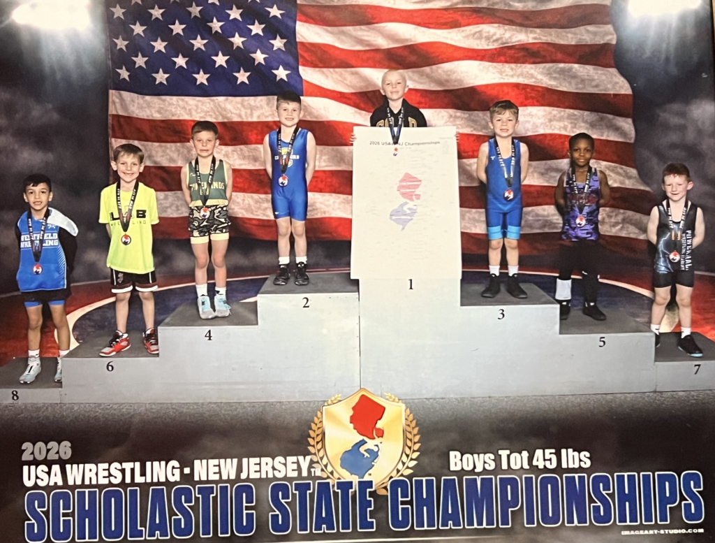 Luca worked hard to get there, coming in with a 60-0 undefeated record during the season. After five matches pinning the best of the best around the state in his 5- to 6-year-old age group and 45-pound weight class during states, he came out on top by beating Luke Ridge of Cranford. It was fast, just 35 seconds.