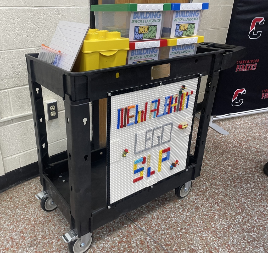 Mannon’s carts are stocked with organized LEGO-themed activities and therapy materials to support hands-on speech and language learning.