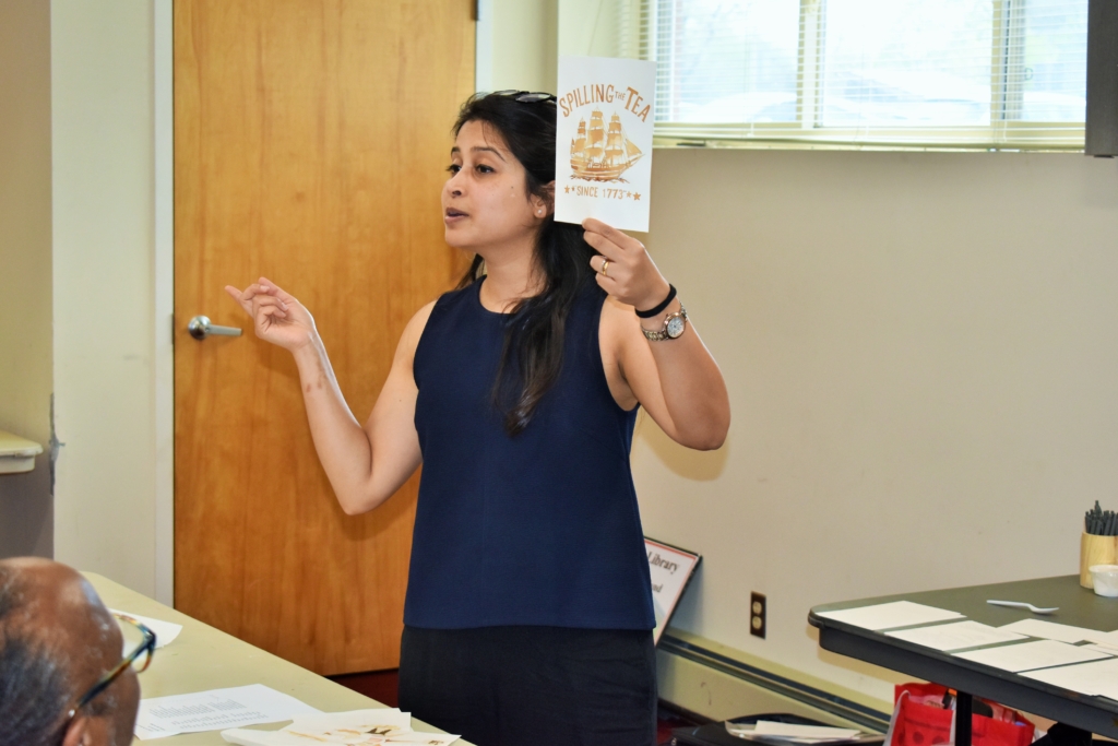 In honor of the country’s 250th anniversary, Smriti Sangal displayed a tea painting that depicts the Boston Tea Party during a workshop on April 14.