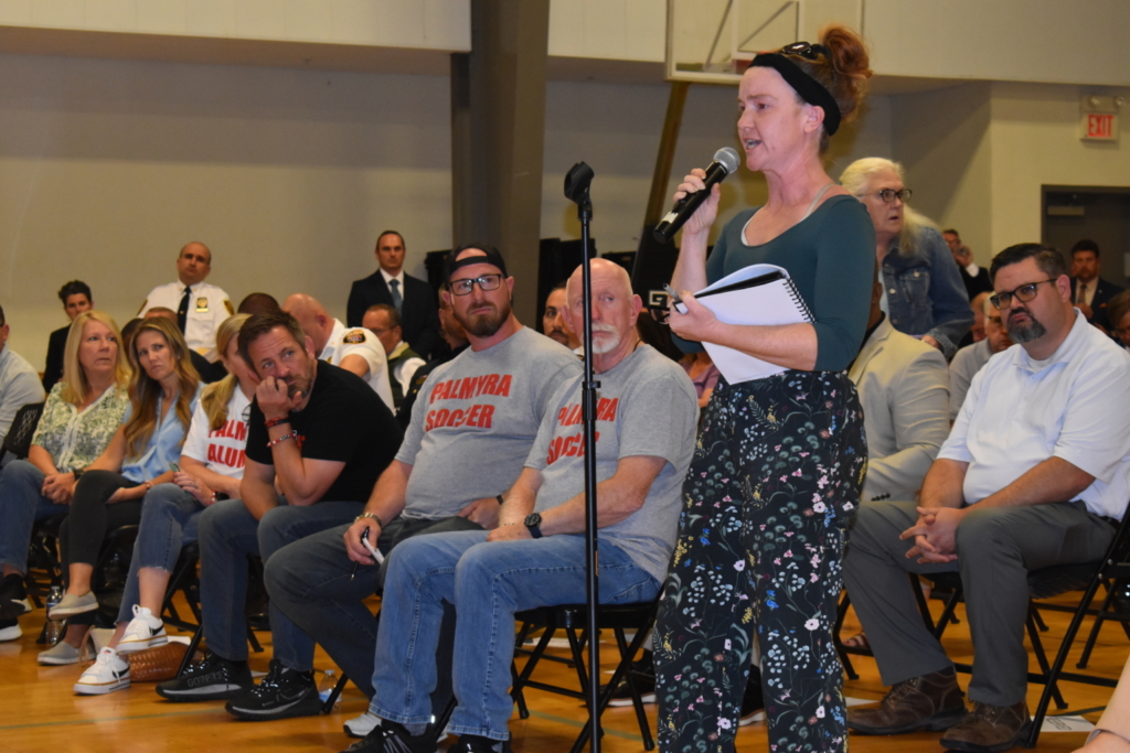 A resident asks NJ Transit officials about the River Line during a public meeting last October at the community center.