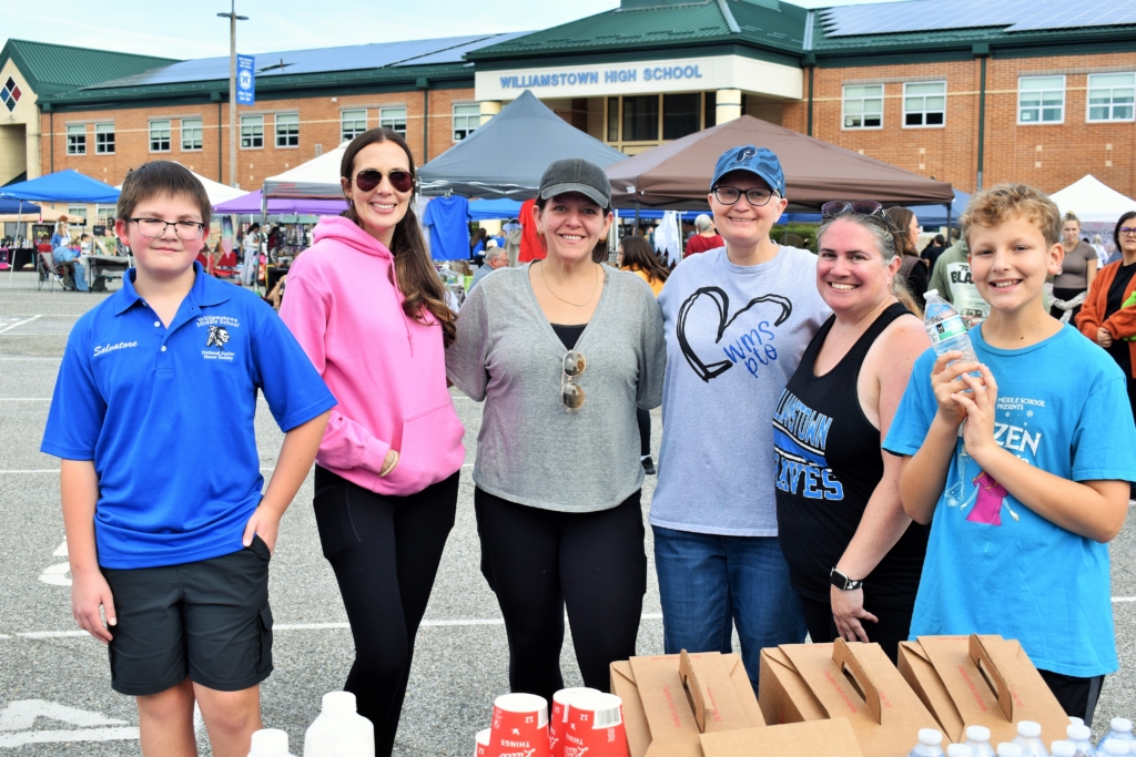 In the Williamstown High School parking lot adjacent to the park, the township middle school’s PTO held its annual fall craft and vendor fundraiser, with nearly 50 booths of merchants selling arts and crafts. Distributing free water and snacks were PTO members Jess Simpkins, Melissa Lutz, Maria Spade, Alison Peters and students Salvatore Doelling and Bryce Casalunovo.