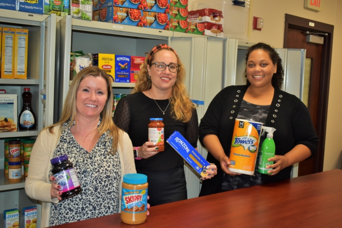 Laura Easter (left to right), Samantha Van Kooy and Sierra Johnson display some of the items available to students at the Rowan College of South Jersey Food Pantry at the Deptford campus in Gloucester County on Monday, Sept. 22.