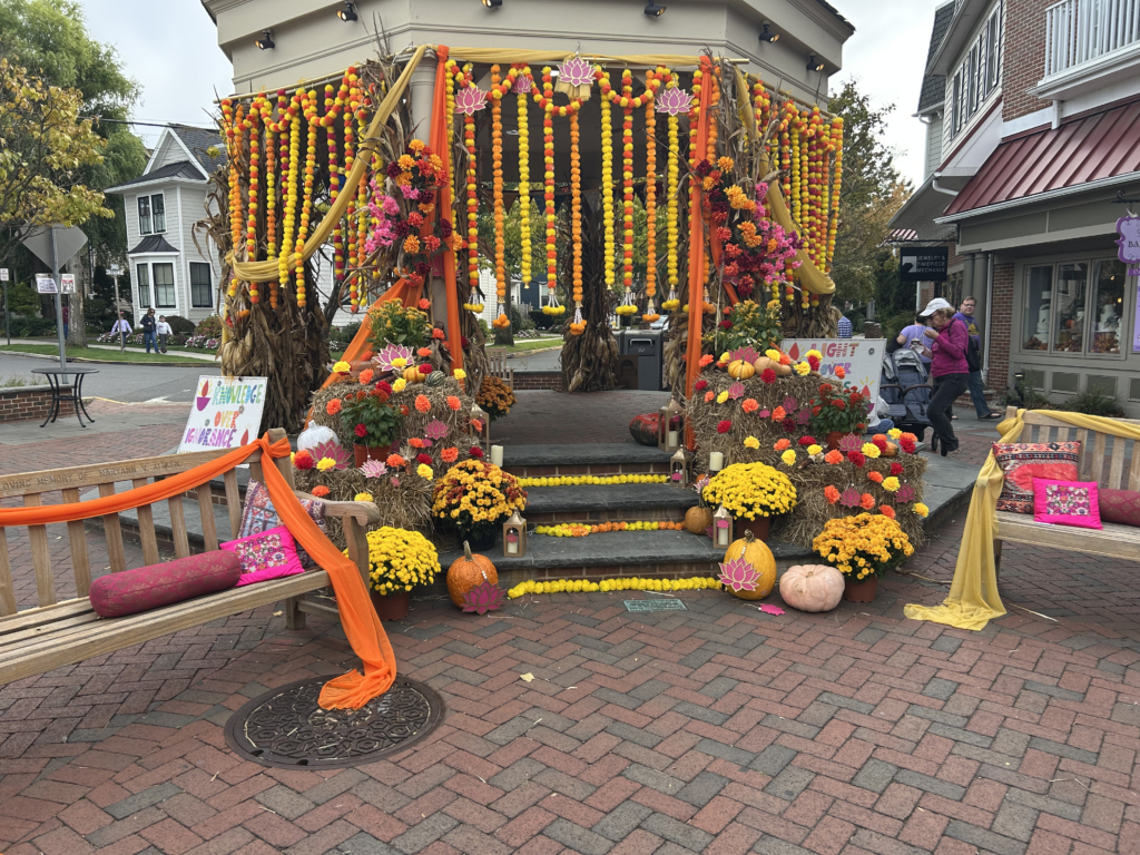 Both days of celebration in the borough were held in Kings Court, with its gazebo and the benches surrounding it decorated with floral garlands, brightly colored signs and pillows featuring intricate patterns to go along with pumpkins and hay already there.