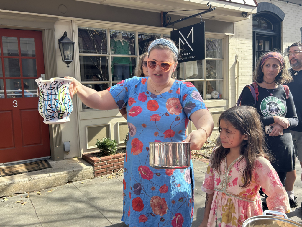 Caroline Easow used a pot and a pitcher to demonstrate how to aerate chai to enhance its flavor during the Diwali event.