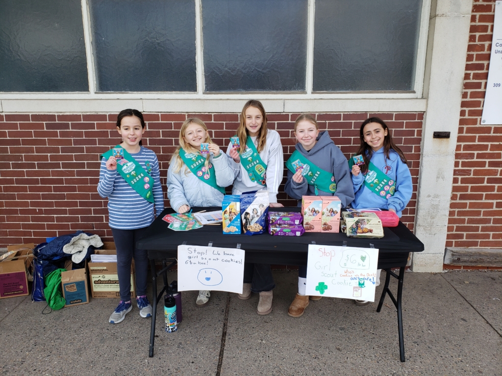 Girl Scouts Nora Kuczynski, Susanna Banks, Ainsley Neuman, Piper Wattai and Hannah Feney sell cookies at the Acme on Ellis Street.