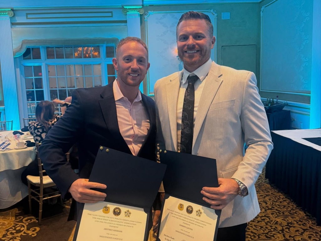 Detectives Jeffrey Krieger (left) and Robert Layton are shown with the meritorious service awards they received during the Gloucester County Police Awards Banquet on Oct. 23.