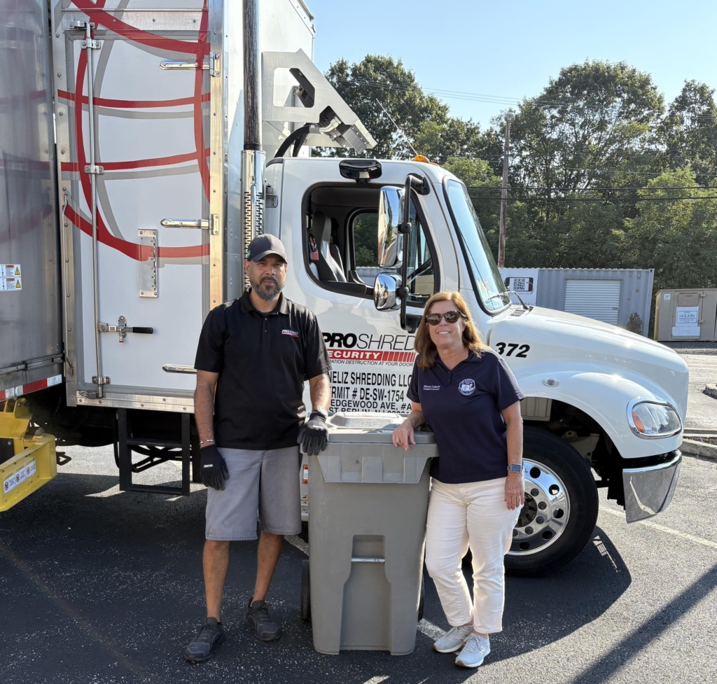 Township Committeewoman Eileen Lukens (right) poses with a Pro Shred Security worker during a shredding event in September.