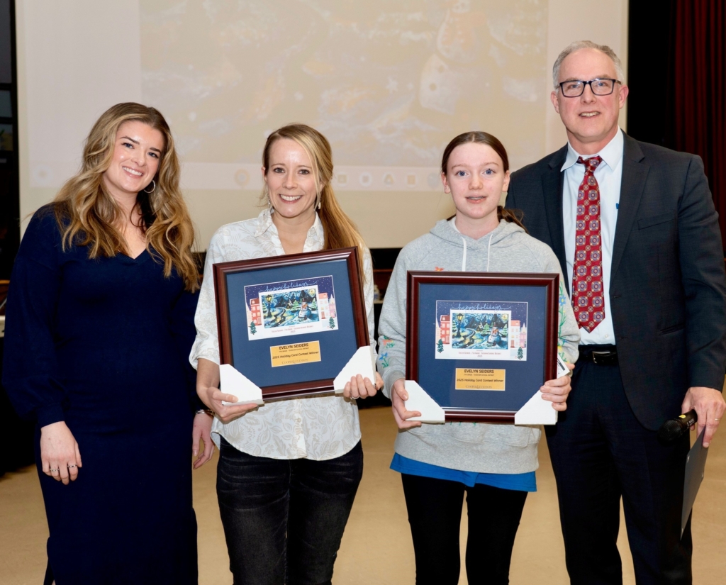Cooper-Levenson attorney Jo-Anna Daly (left to right), Marlton Middle School teacher Kate Gormley, seventh grader Evelyn Seiders and Evesham school Superintendent Dr. Justin Smith with Seiders’ winning card.