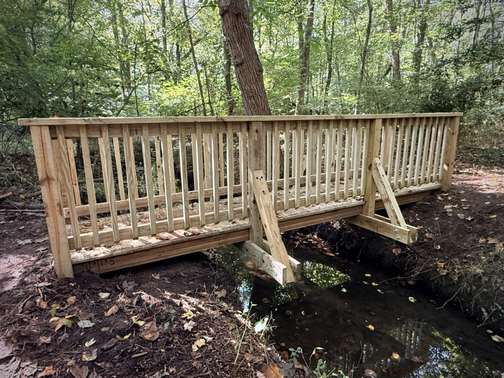 Save the Environment of Moorestown (STEM) and P&H Renovations teamed to rebuild and improve the bridge behind Baker Elementary School last month, just upstream from the old one.