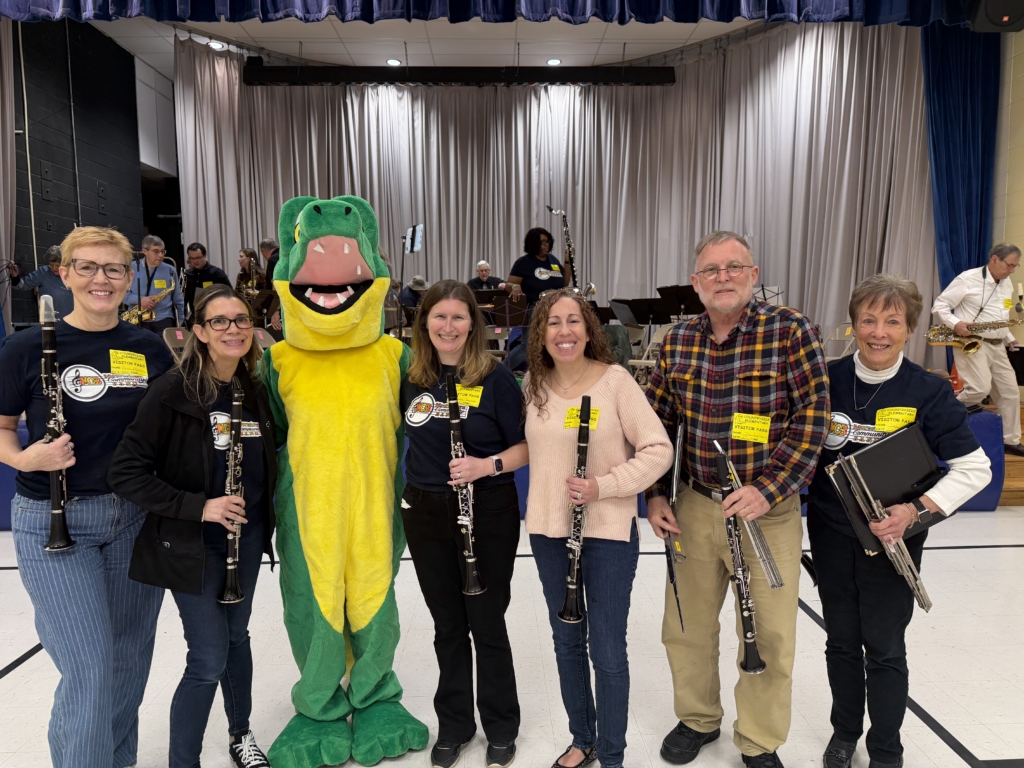 The Moorestown Community Band’s “Clarinet Army,” with Countryside Elementary School mascot Clyde.
