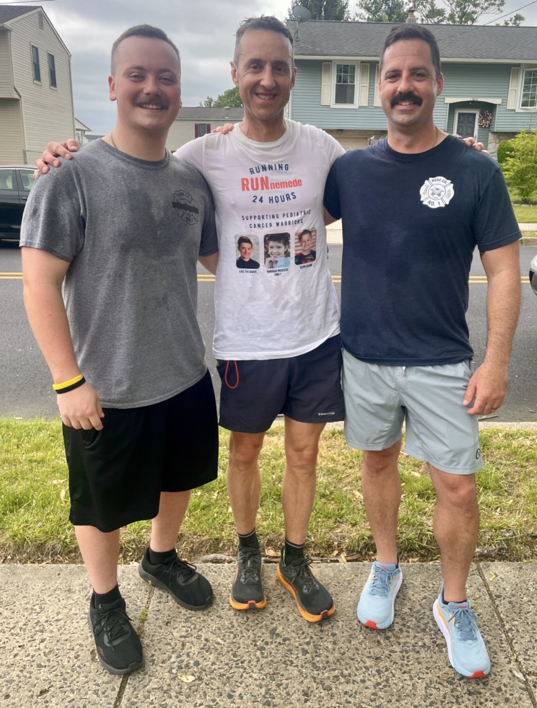 Moorestown resident Christian Whipple (center) will embark on a 100-mile run to benefit the National Brain Tumor Society this month. Fellow Moorestown firefighters Tommy Constantine (left) and Bart Santaspirt surprised Whipple by running with him during an initiative to raise funds and awareness for pediatric cancer warriors and the KICKcancER Movement.