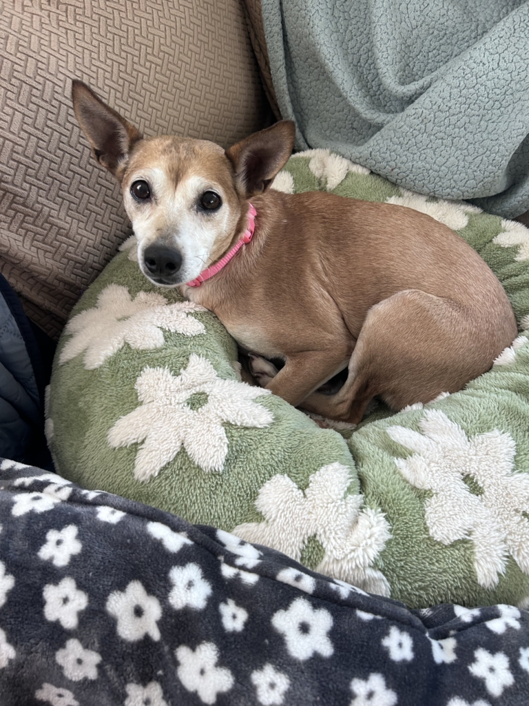 Marla is a Rat Terrier mix with a soft yellow coat who weighs about 21 pounds and is 6 to 7 years old. She ended up in an overcrowded shelter as an owner surrender with her two puppies.