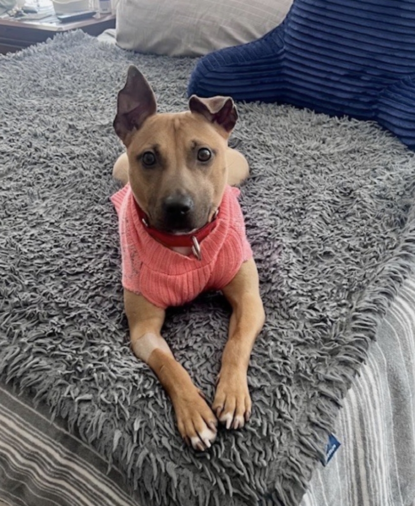 Vixen enjoys playing with toys, romping with her foster sisters, soaking up cuddles and earning treats. She has a medium energy level, balancing playful bursts with plenty of downtime, and is just as happy curling up next to you as she is playing. If Vixen’s future home has another dog, it would be best if that canine enjoys playtime as much as she does.
