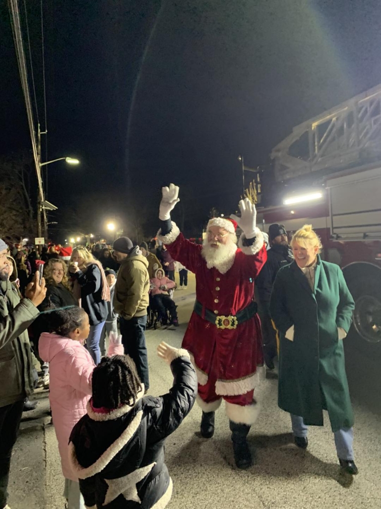 Santa Claus and Assemblywoman Carol Murphy (in green coat) greet residents at the township’s fifth annual tree lighting on Dec. 4.