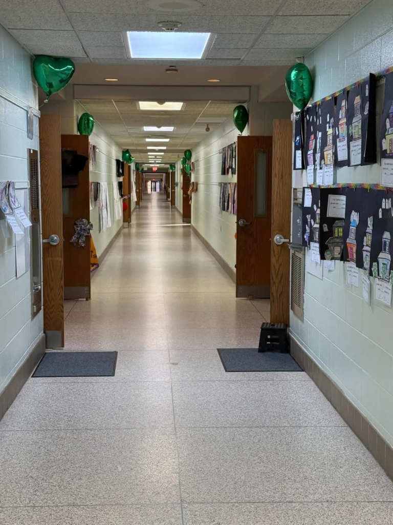 She completed her student teaching at Pleasant Valley with Megan Sakhleh, then took up her position at Harrison. Her children, Laura and Nick, also became teachers. The school is wearing green in her honor.