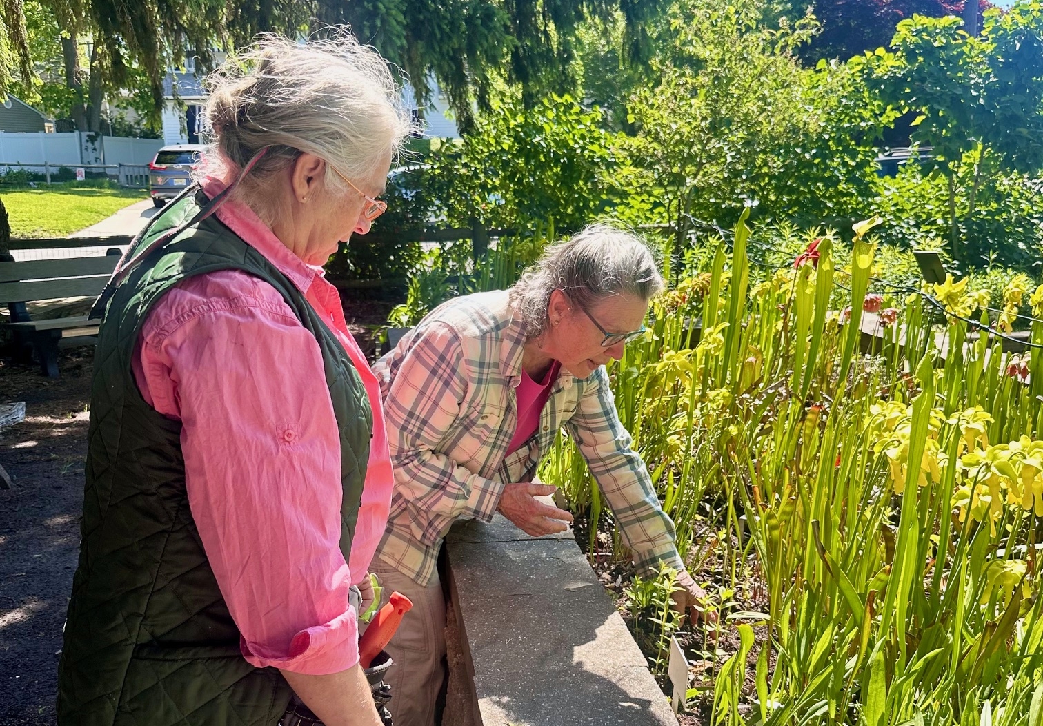 Marian Jordan and Meredith Koenig at the raised bog garden.