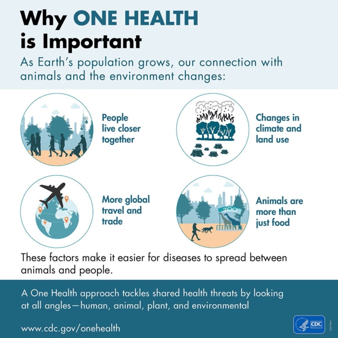 One Health is a concept that recognizes the strong connections and interdependencies between human, animal, and environmental health and calls for a collaborative, multi-sector, and transdisciplinary approach. One Health issues include, but are not limited to, zoonotic diseases, vector-borne diseases, antimicrobial resistance (AMR), food safety and security, environmental contamination, climate change, and other collective health threats faced by people, animals, and the environment.