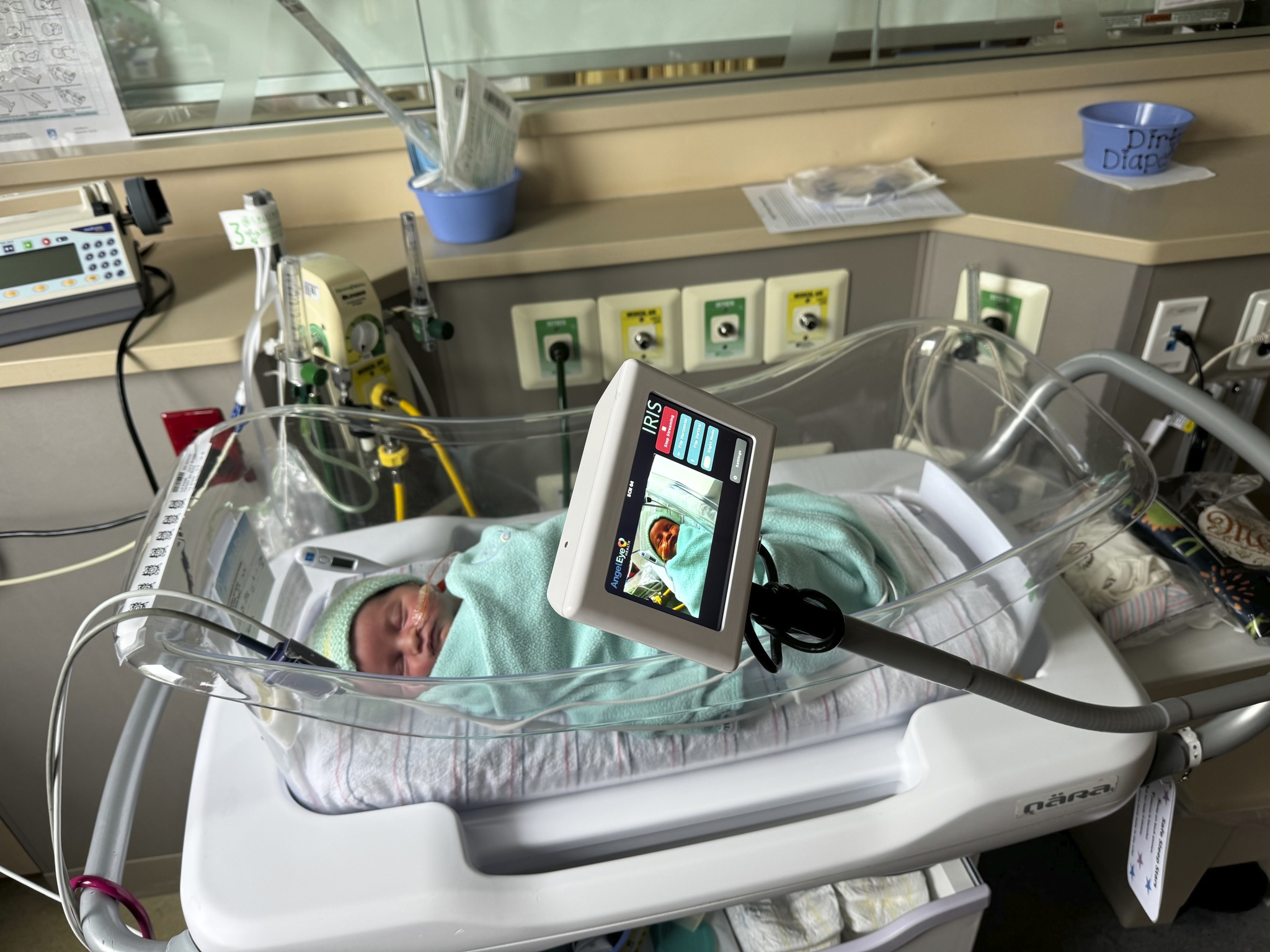 The AngelEye Health camera system gives parents the ability to securely share access to the live feed of their baby. Except during certain treatments and procedures, the camera is on around the clock. To date, every family has consented to utilizing the technology since it was installed and launched.