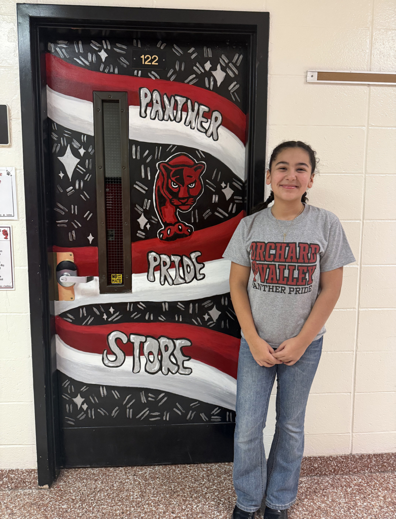Orchard Valley Middle School sixth-grader Hanna Emanet created a design that was “a-door-ed” by her school, and her efforts will be showcased there permanently. Orchard Valley hosted a building-wide contest to create a new design for the Panther Pride school store’s door. Emanet won, then worked with art teacher Larissa Danowitz to bring it to life.