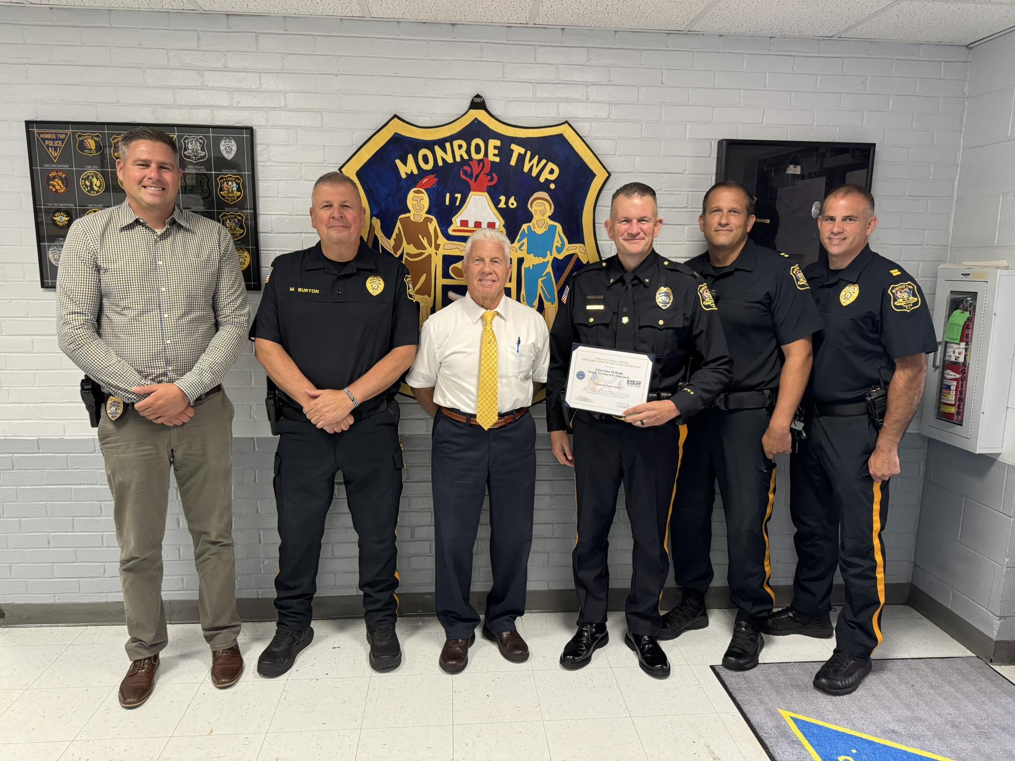 Courtesy of the Monroe Township Police Department Police Chief John McBride recently accepted the Patriotic Employer Award from the U.S. Department of Defense on behalf of the Monroe police department. The award was presented by retired Marine Col. Alan Smith in recognition of the police department’s continued support for its officers who also serve in the military. The certificate will be displayed at police headquarters to also recognize the force for providing employment opportunities to guardsman, reservists and transitioning service members and veterans. The award nomination was submitted by officer Justin Fyffe, who is currently deployed with the Marines and who began his career with the police department in 2024.